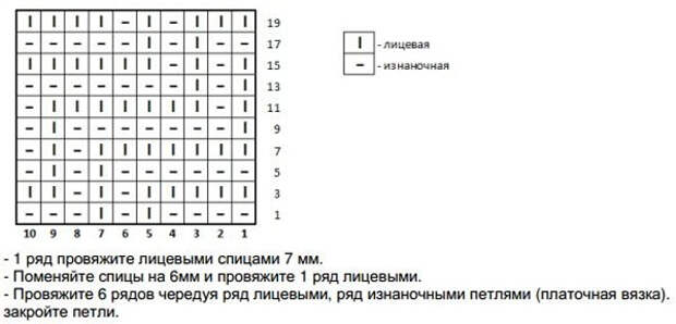 Узор довольно прост — используется чередование лицевых и изнаночных петелек.