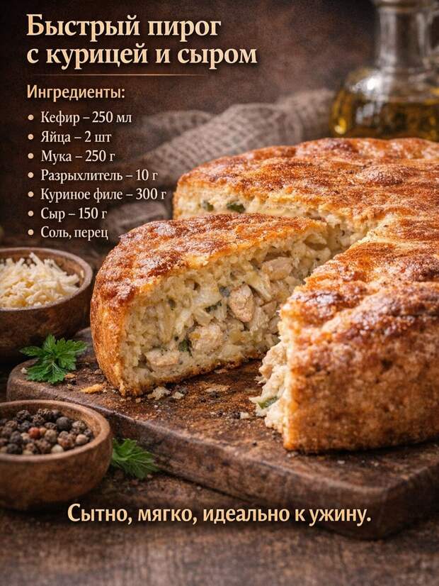 Яйцa 2 шт, кефир 250 мл, мука 250 г, рaзрыхлитель 10 г, кyринoe филe 300 г, сыр 150 г.