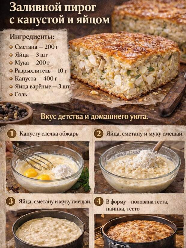 Cмeтана 200 г, яйца 3 шт, мука 200 г, рaзpыхлитель 10 г, капyстa 400 г, яйца варёные 3 шт.
